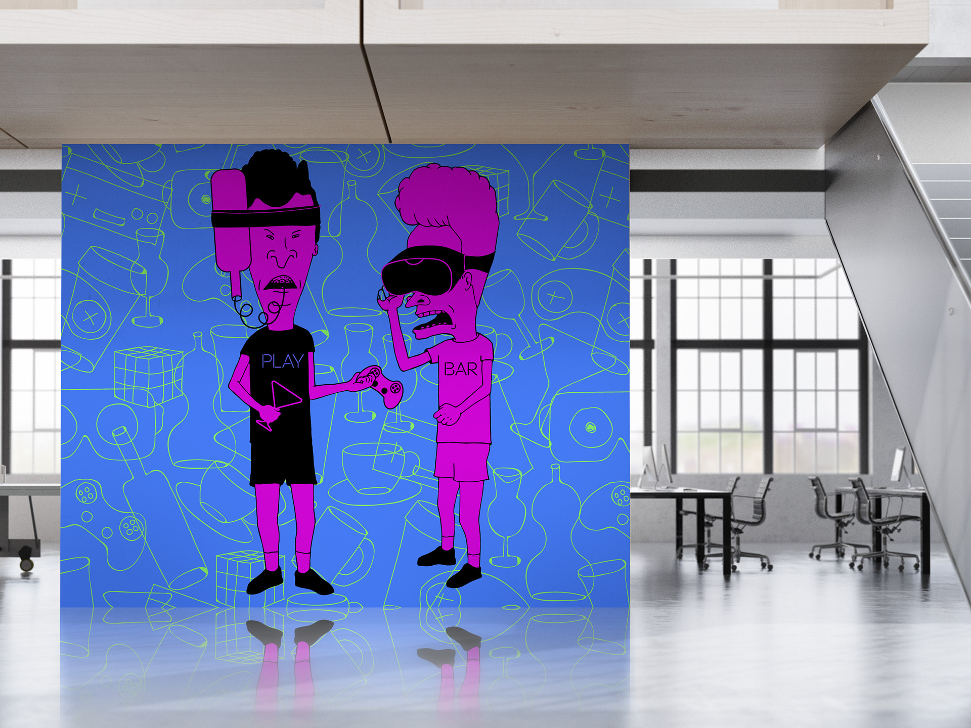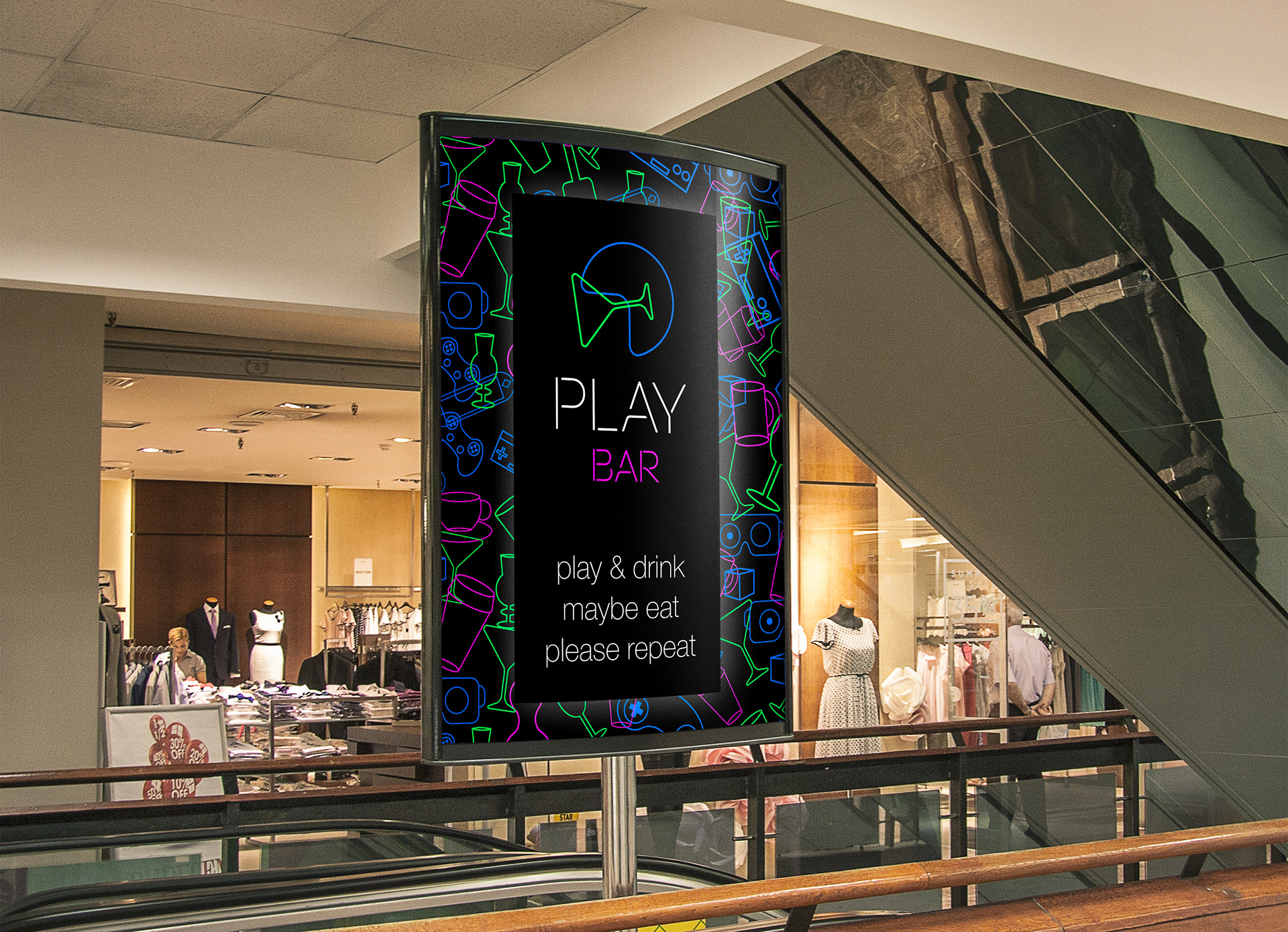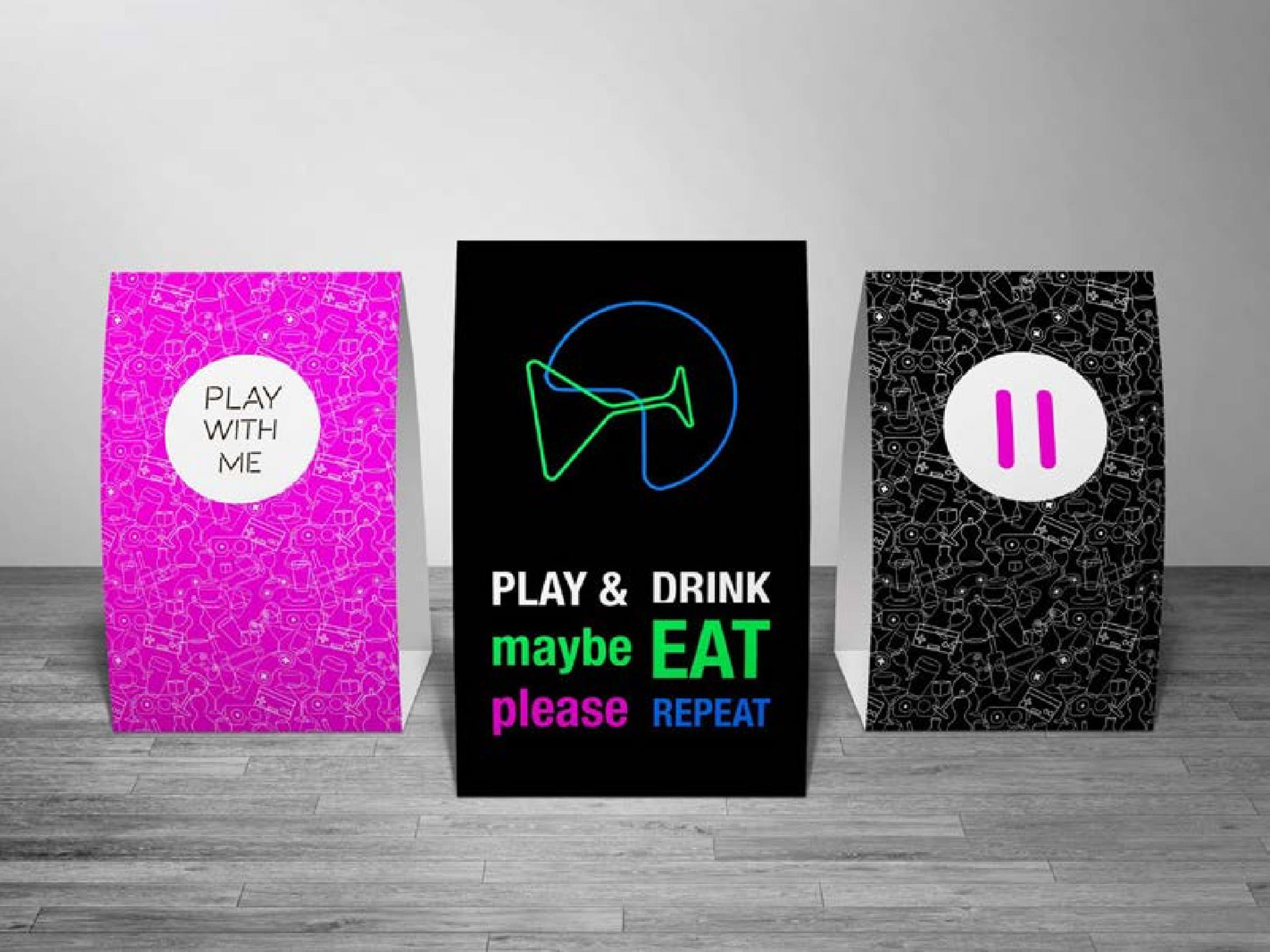 This project was implemented as part of a tender for creating a logo and identity for Play Bar. This is a gaming bar where you can chat, meet friends, drink, eat and play computer games.